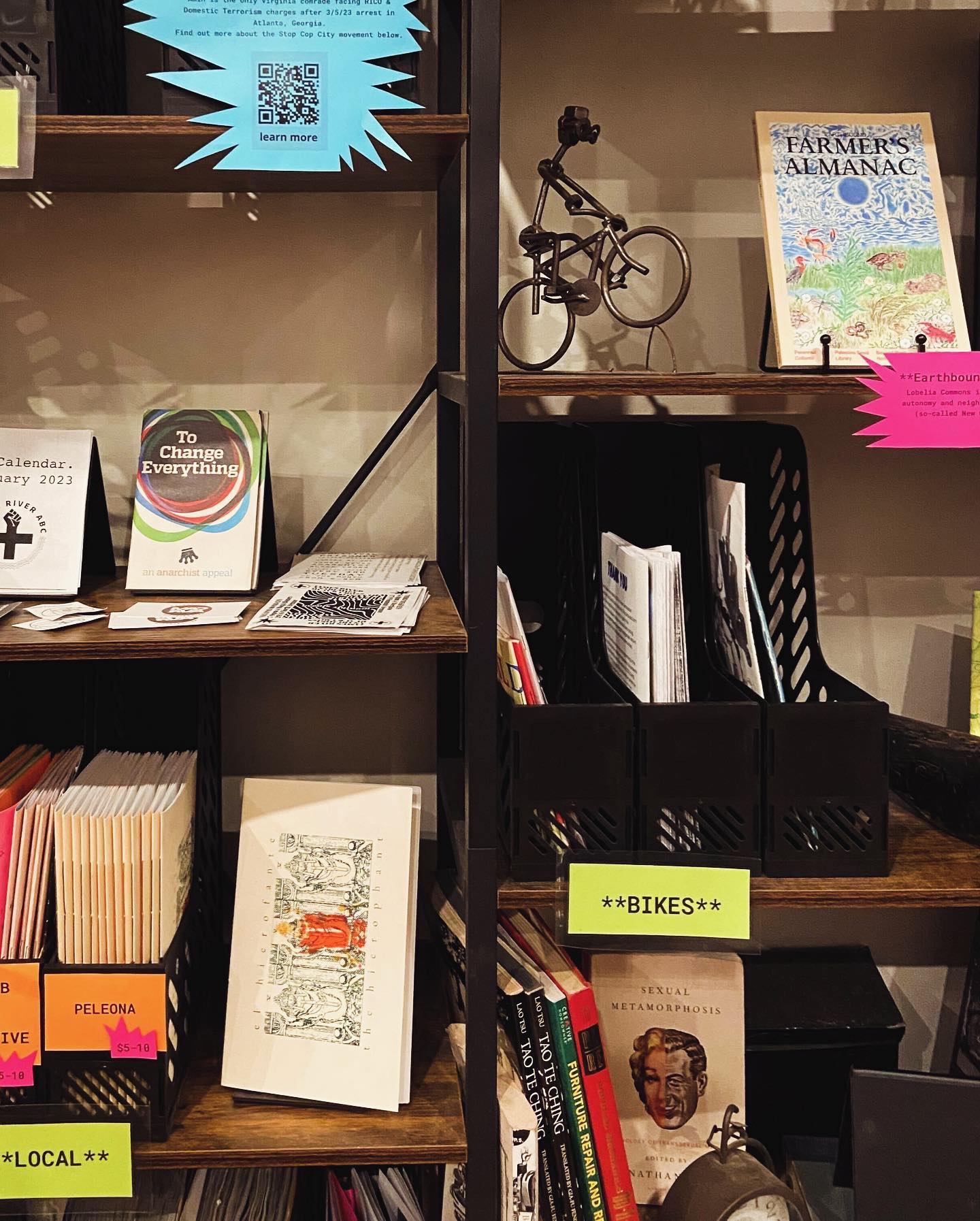 As an educational space first and foremost, we maintain a sliding scale zine space, where you can get zines for $1-5. The library sells a variety of printed media from local to global, on everything from bikes to gardening, political theory to much. We purchase local zines from sellers to have in stock, so if you’d like us to sell your zine send us an email at connect@ragandbonesrva.org.