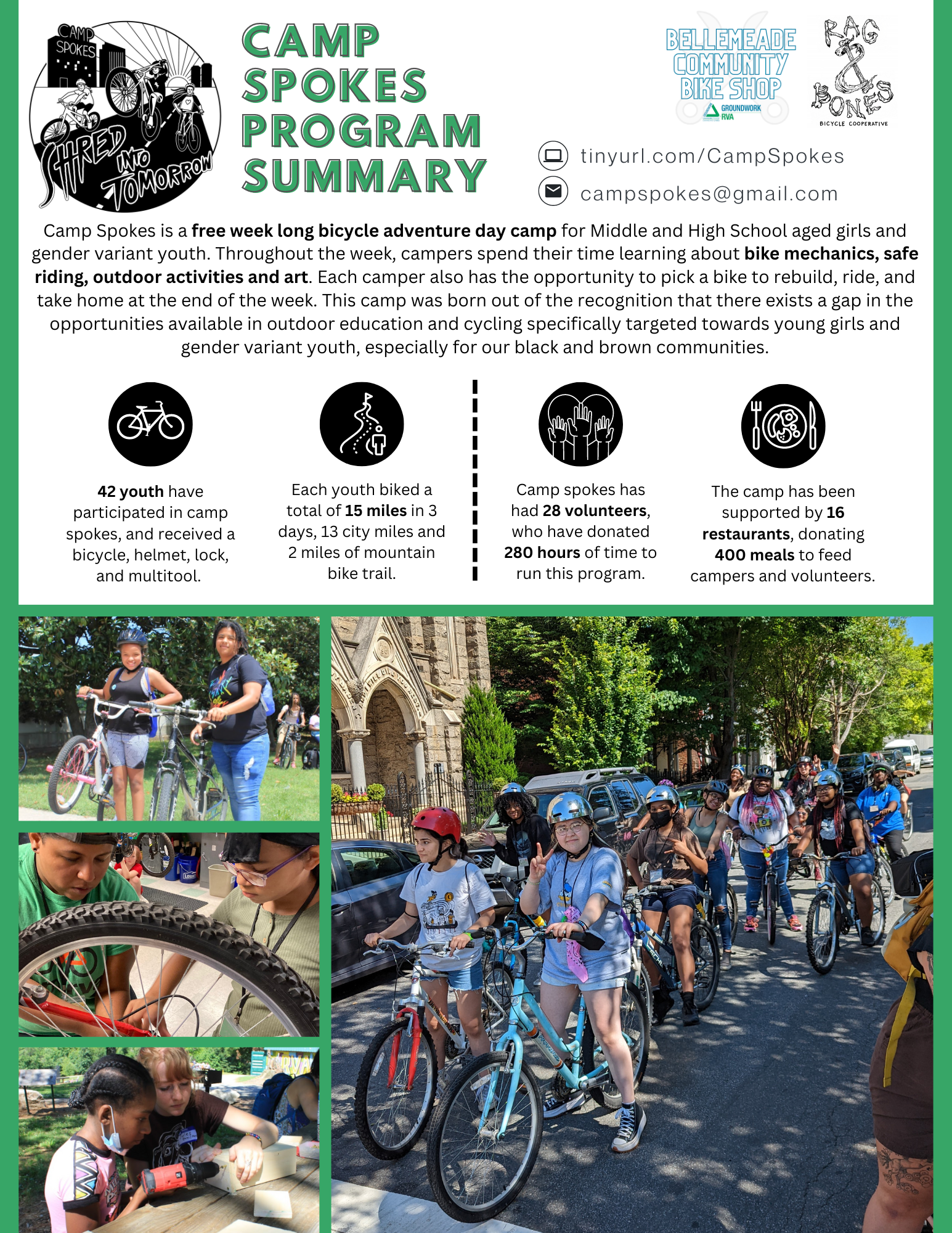 In 2021 Camp Spokes ran for one week in partnership with A Better Day Than Yesterday. In 2022 the camp was divided into a one week for high schoolers and one week for middle schoolers, in partnership with Communities in Schools. Two high schoolers were invited back to be paid junior counselors through Groundwork RVA. In 2023, we added an Adventure Overnight experience! In 2024, we took some of our Youth Leaders to the Youth Bike Summit in Allentown, Pennsylvania.
